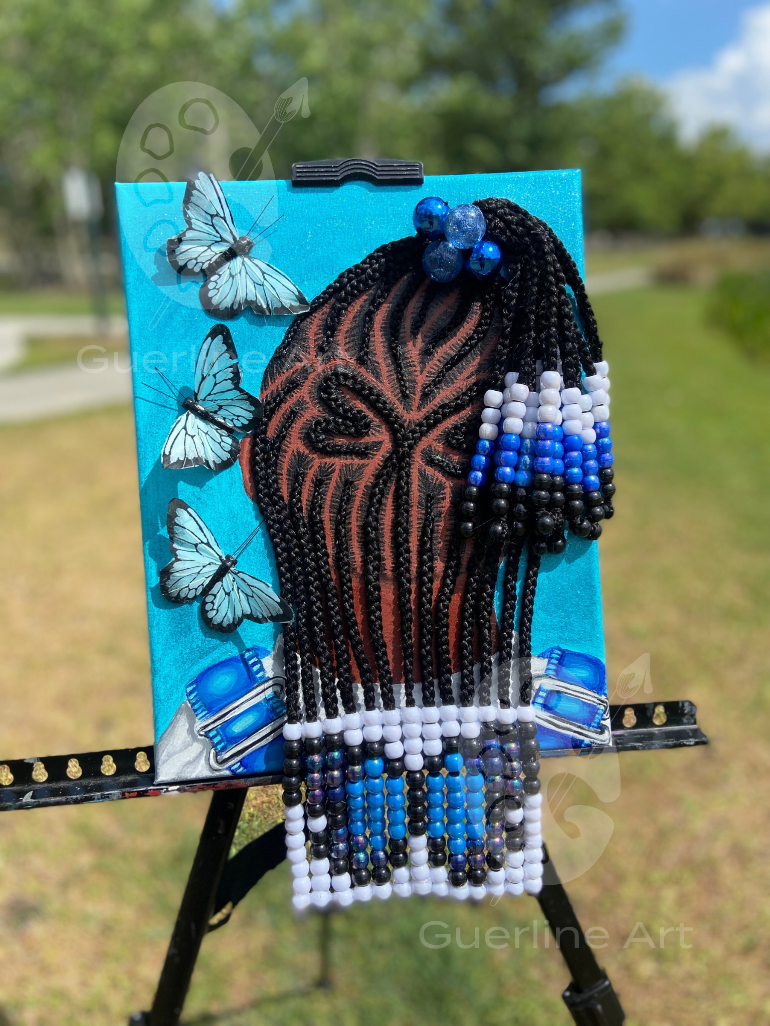 Materials used: Acrylic paint, braiding hair, beads, ball ties, faux butterflies