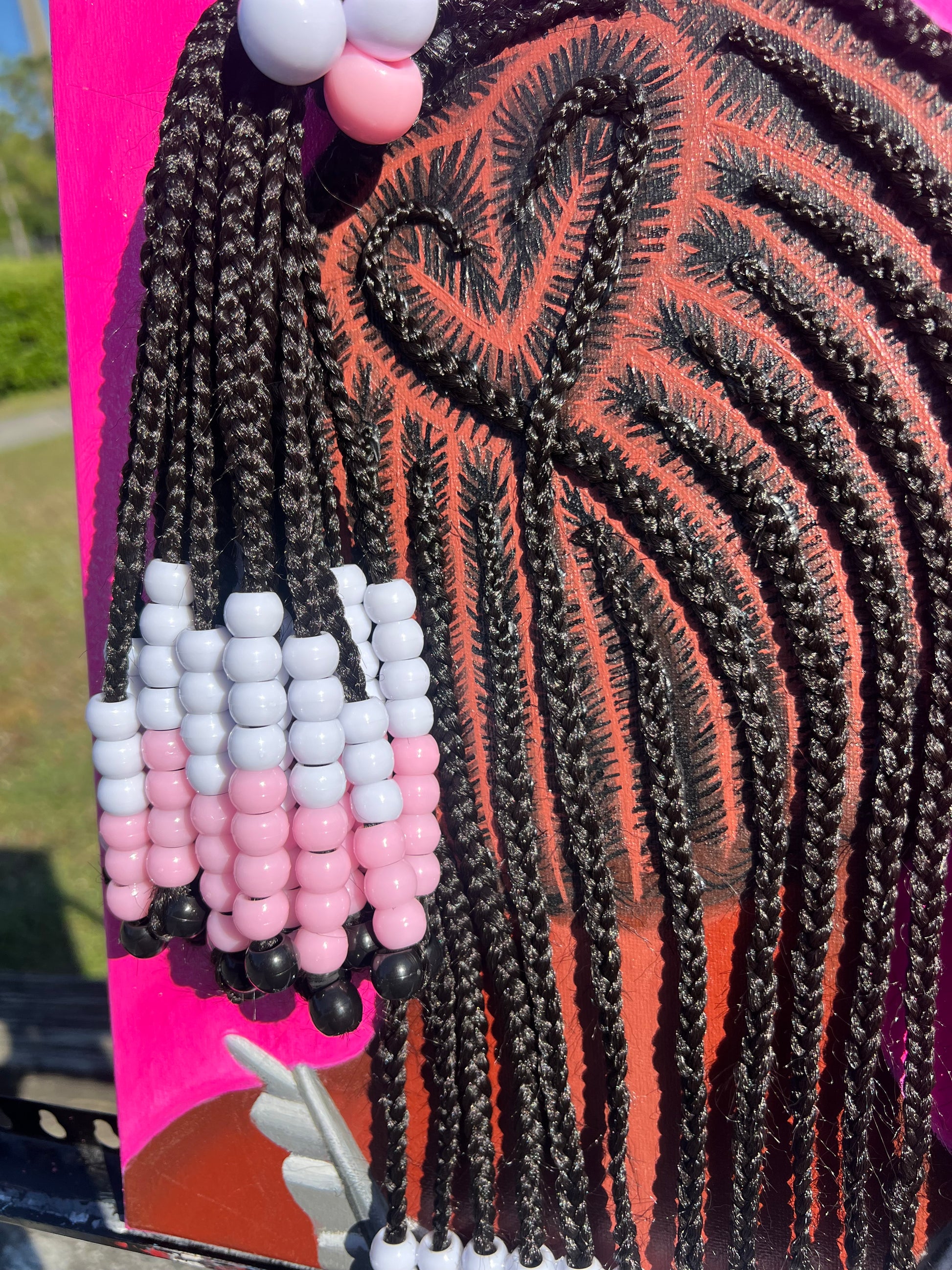 Materials used: Acrylic Paint, braiding hair, beads and ball ties