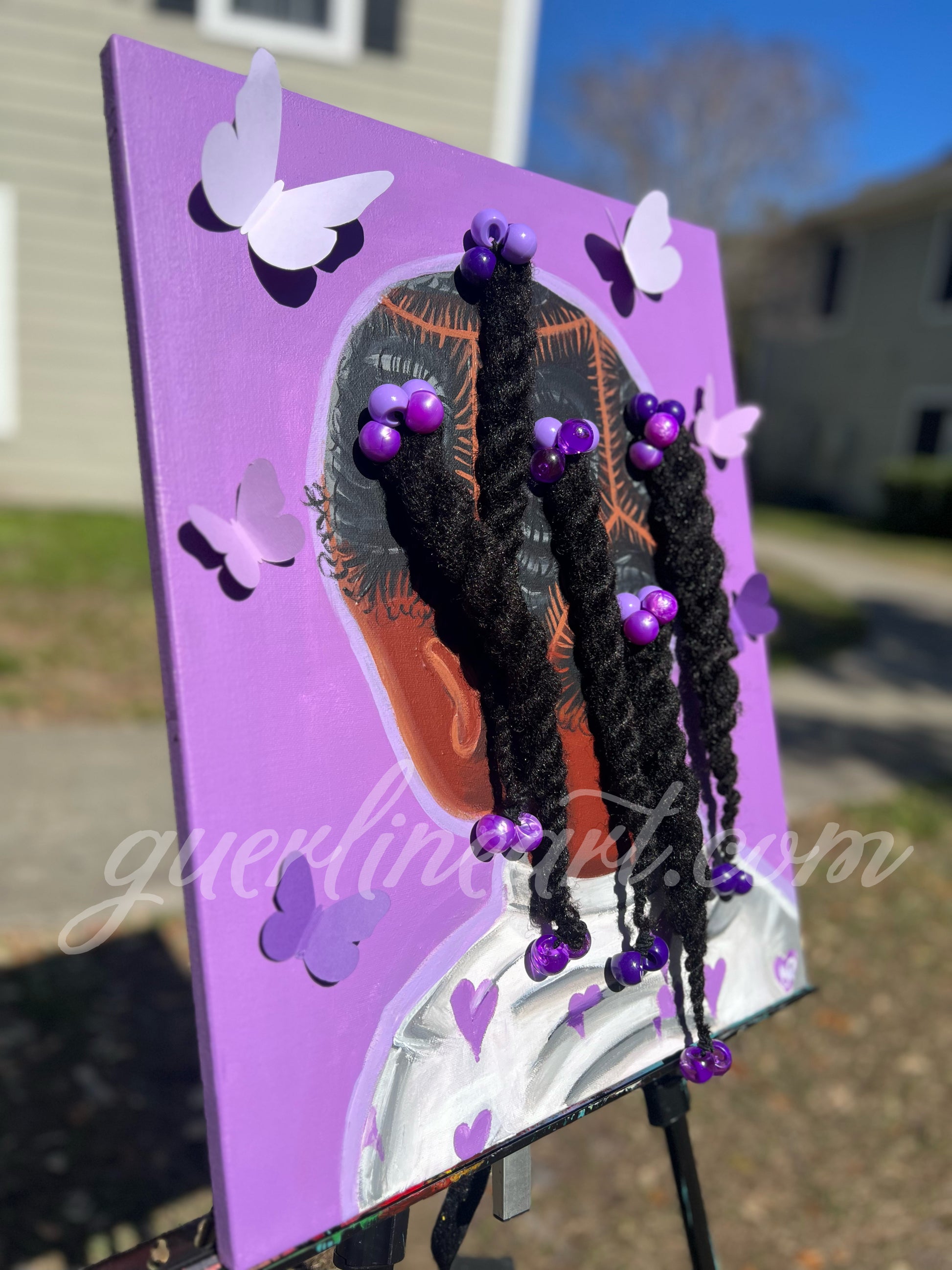 Material: acrylic paint, paper butterflies, hair ties and synthetic 4c hair